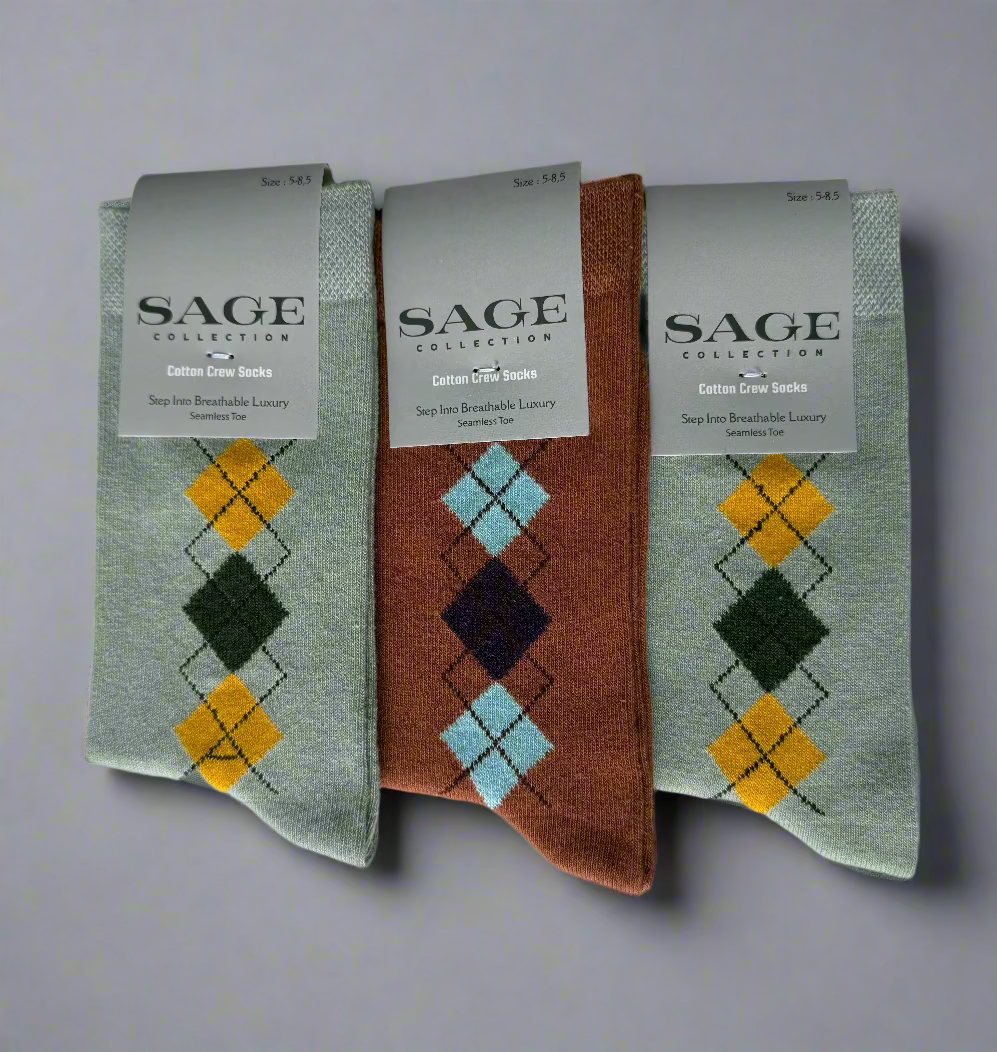Step into breathable luxury with our Premium Cotton Crew Socks 3-Pack from Sage Collection—crafted for softness, breathability, and all-season wear. Each pack features an elegant mix of earthy tones like Sage Green and Mocha Mousse, paired in thoughtful assorted combinations. With a vintage argyle-inspired pattern, these medium-thin, stretchable socks blend timeless style with everyday function. Designed with a seamless toe for irritation-free comfort and a subtle side detail to help distinguish left from right—no more awkward toe bunching or wearing them the wrong way! Made with OEKO-TEX® certified materials to support a healthier planet and more mindful fashion choices.