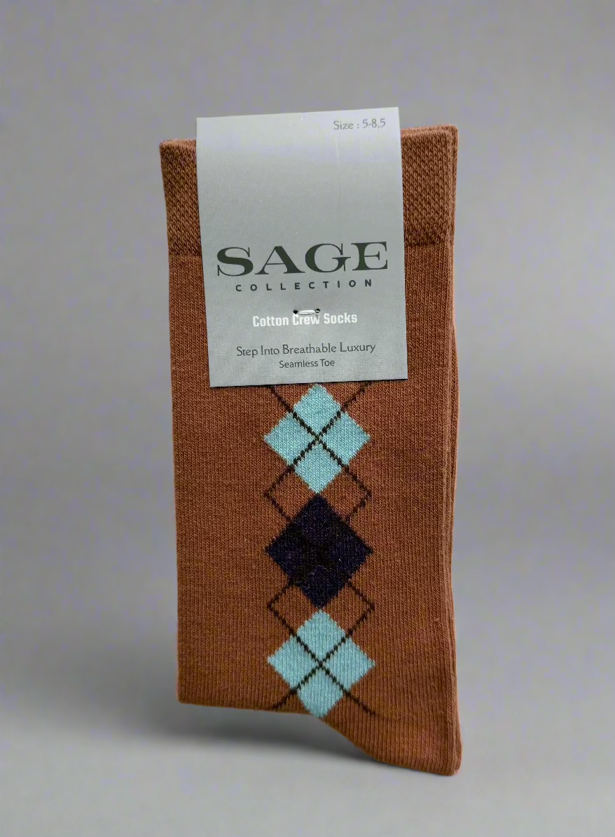 Step into breathable luxury with our Premium Cotton Crew Socks from Sage Collection—crafted for softness, breathability, and all-season wear. Featuring a vintage argyle-inspired pattern, these medium-thin, stretchable socks combine timeless style with everyday function. Designed with a seamless toe for irritation-free comfort and a subtle side detail to help distinguish left from right—no more awkward toe bunching or wearing them the wrong way! Made with OEKO-TEX® certified materials, our socks support a healthier planet and more mindful fashion choices. Available in two earthy tones: Sage Green and Mocha Moss.