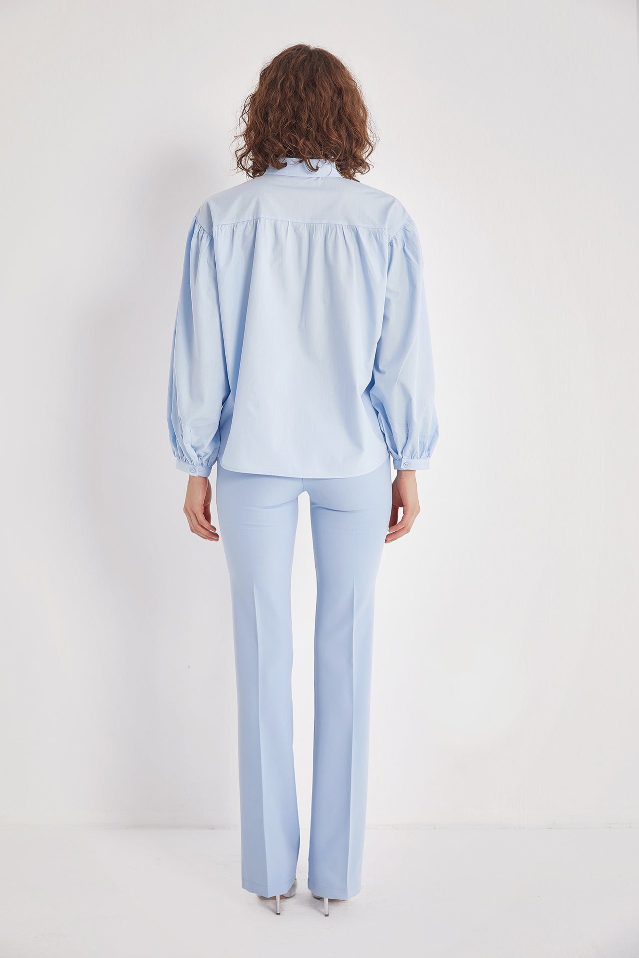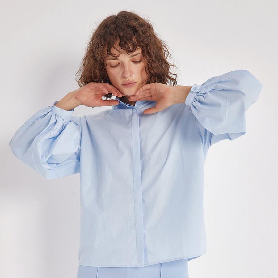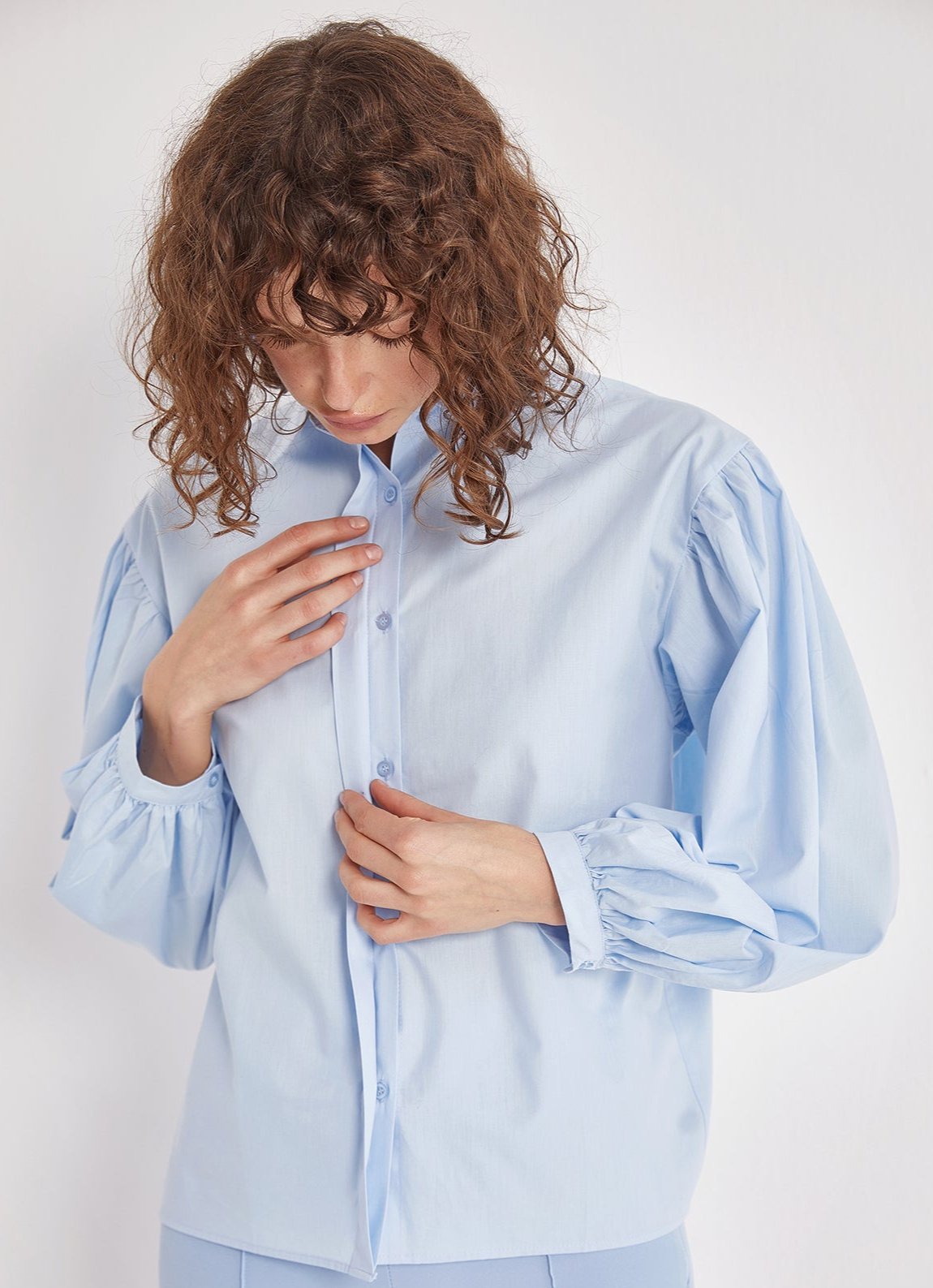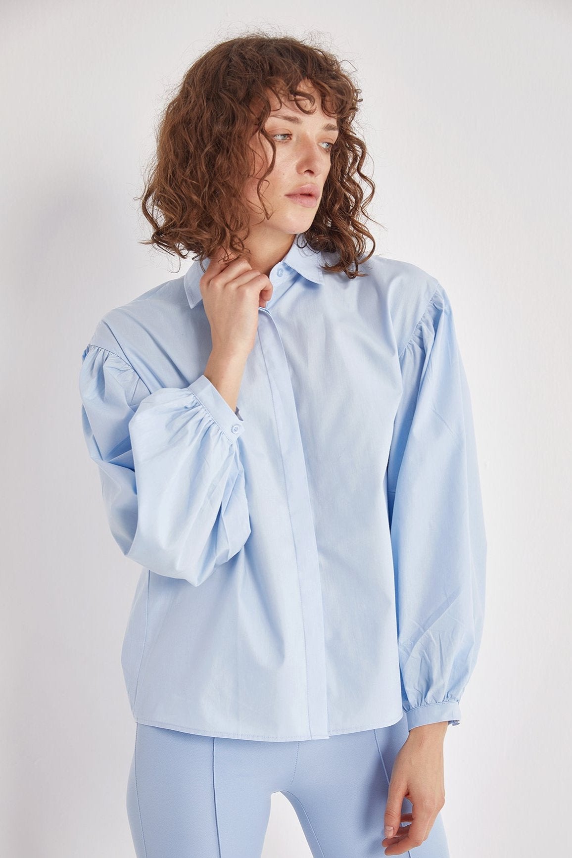 Cotton Poplin Balloon Sleeve Shirt - Baby Blue