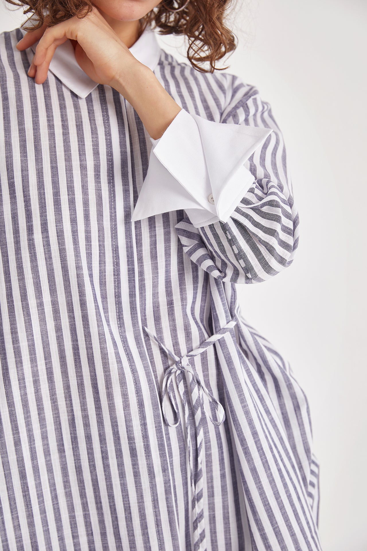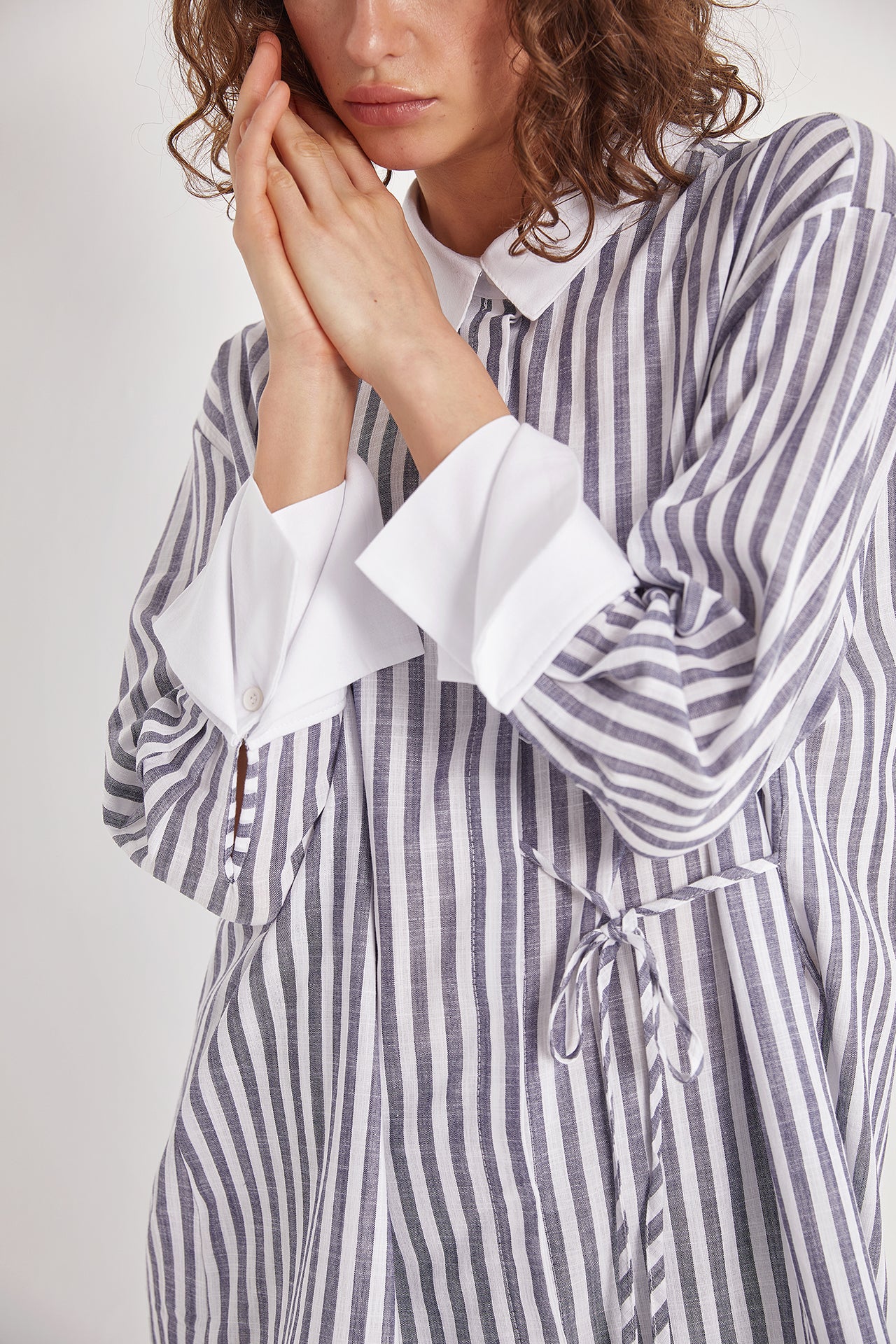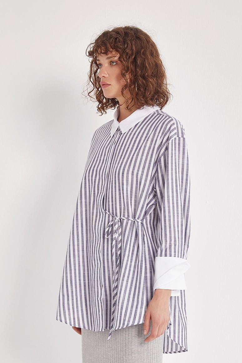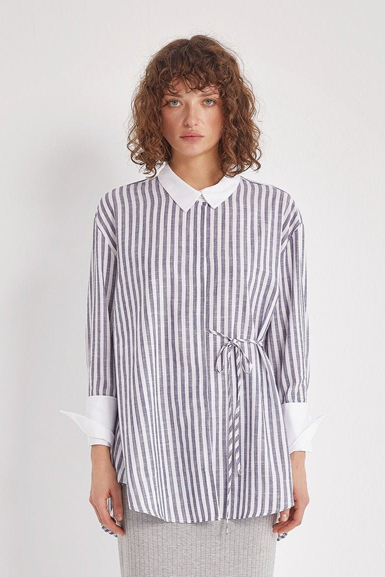 Elevate your wardrobe with our Oversized Cuff Detailed Cotton Shirt, crafted from a breathable blend of 70% cotton and 30% linen for all-day comfort. Featuring original double-cuff details and an asymmetrical thin belt tie, this shirt offers a unique and refined silhouette. Available in both striped and solid colors, including muted tones, it’s perfect for adding versatility and style to your collection.