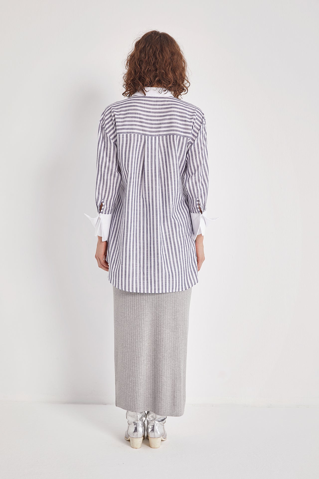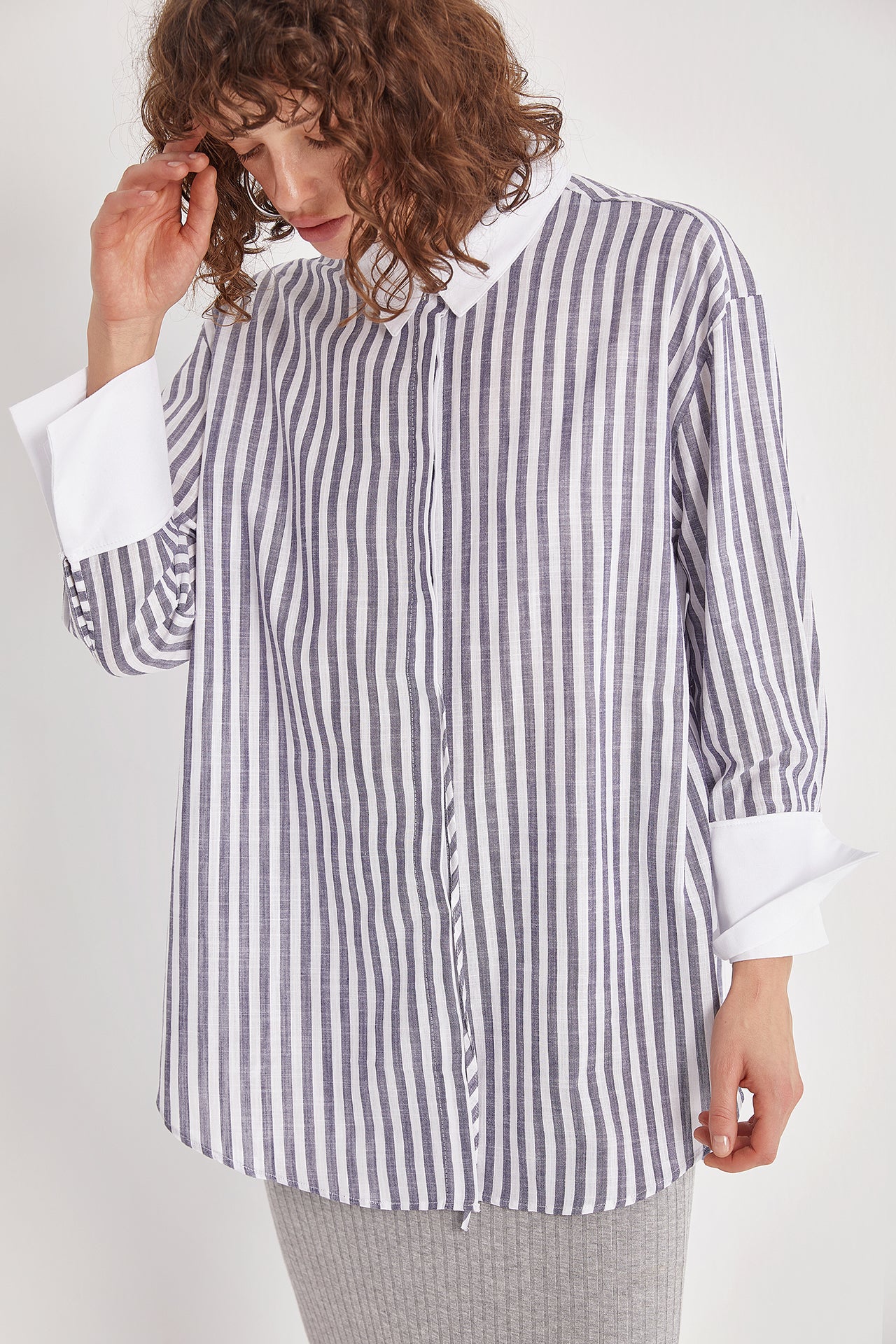 Cuff Detailed Cotton Shirt - Dark Blue Stripe