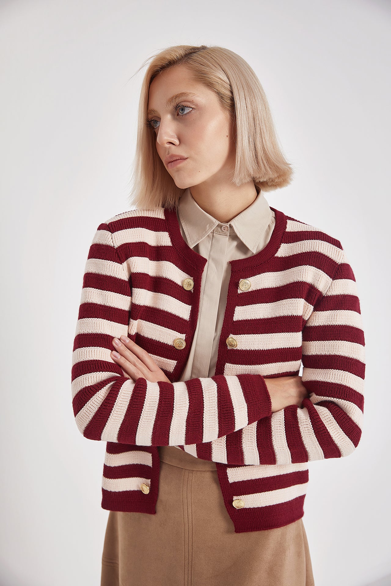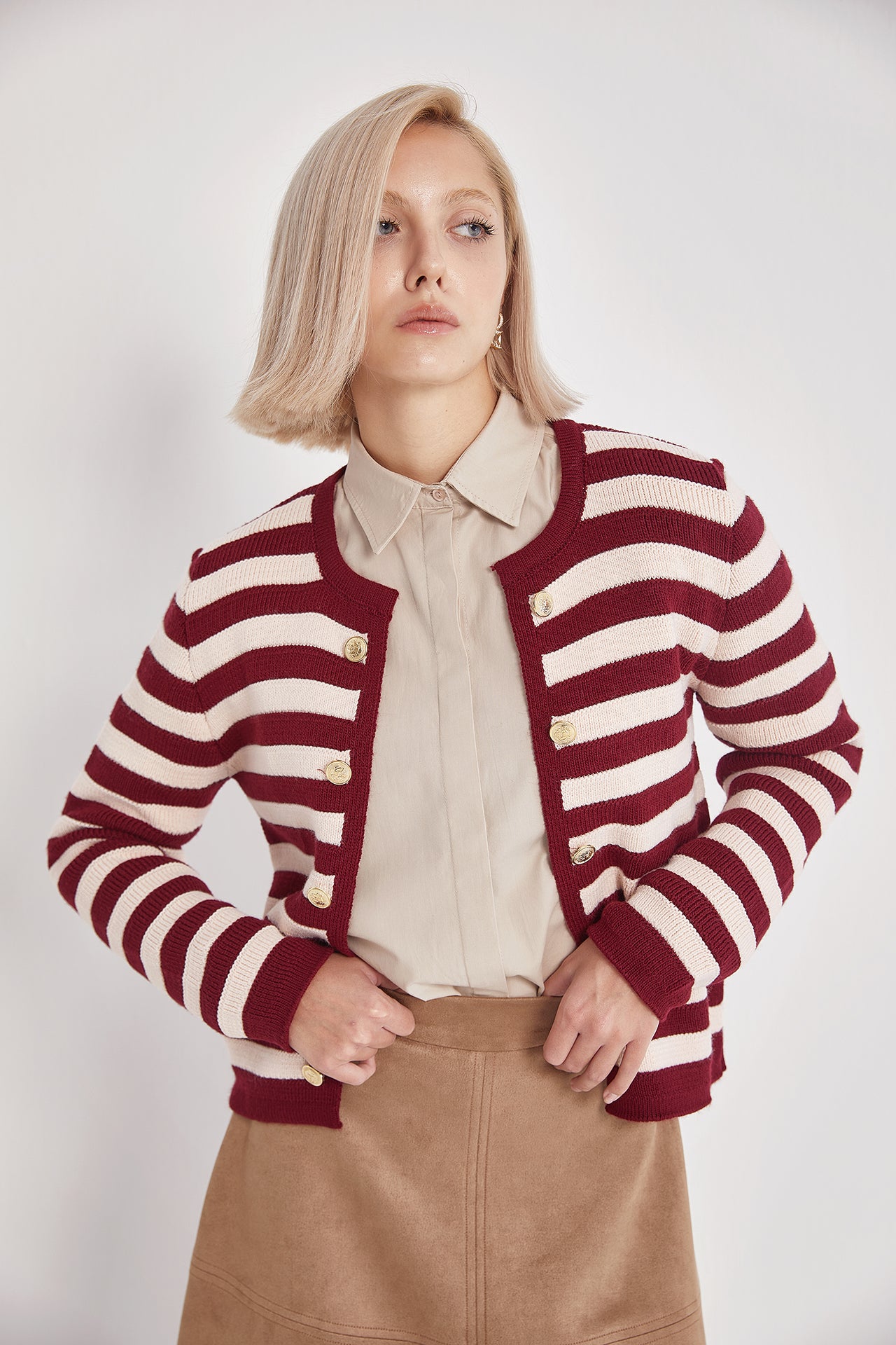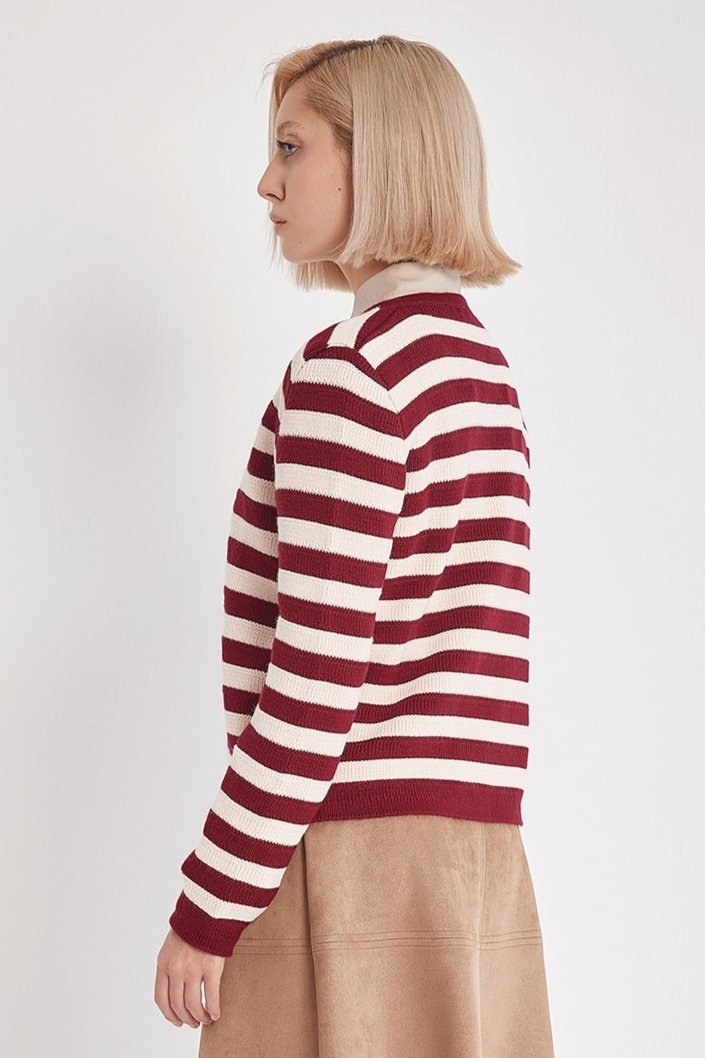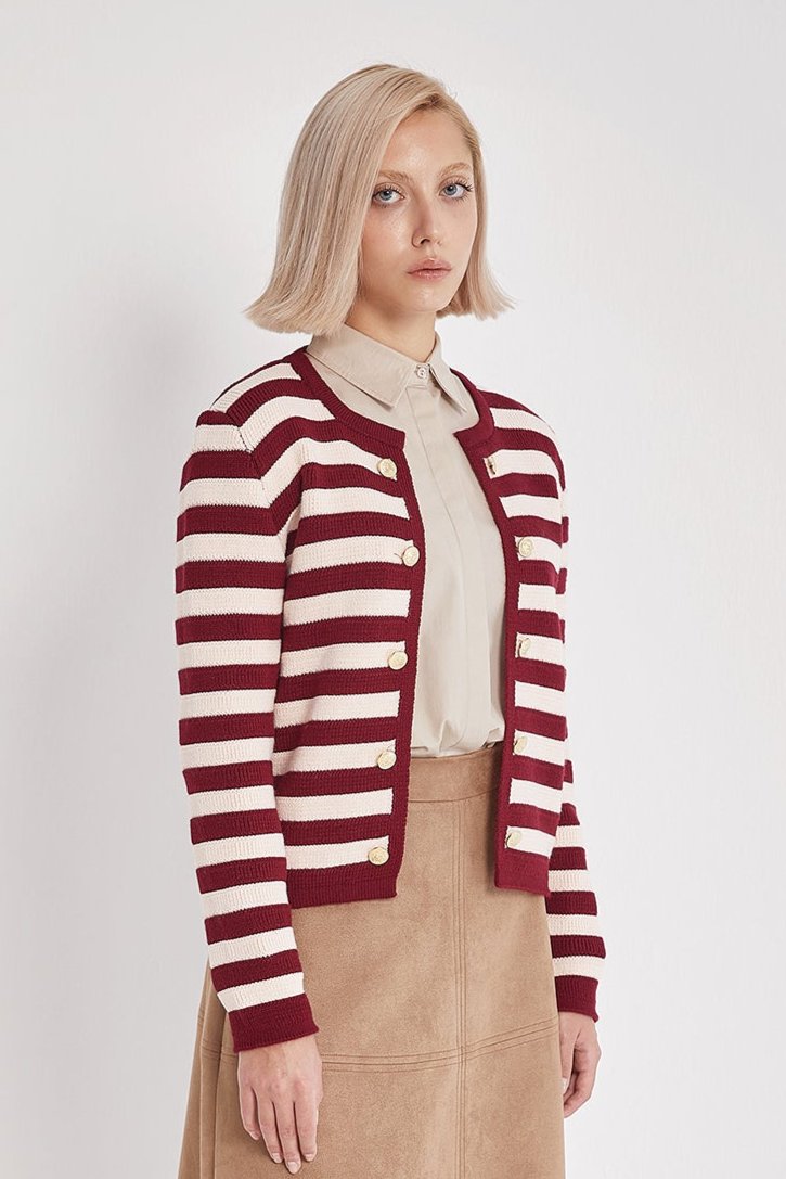 Add a touch of timeless elegance to your wardrobe with the Golden Button Burgundy Striped Knit Cardigan. Crafted from a high-quality cotton blend, it features a chic striped design and signature gold-tone buttons on both sides. Perfect for layering, this cozy cardigan adds warmth and sophistication to any outfit.