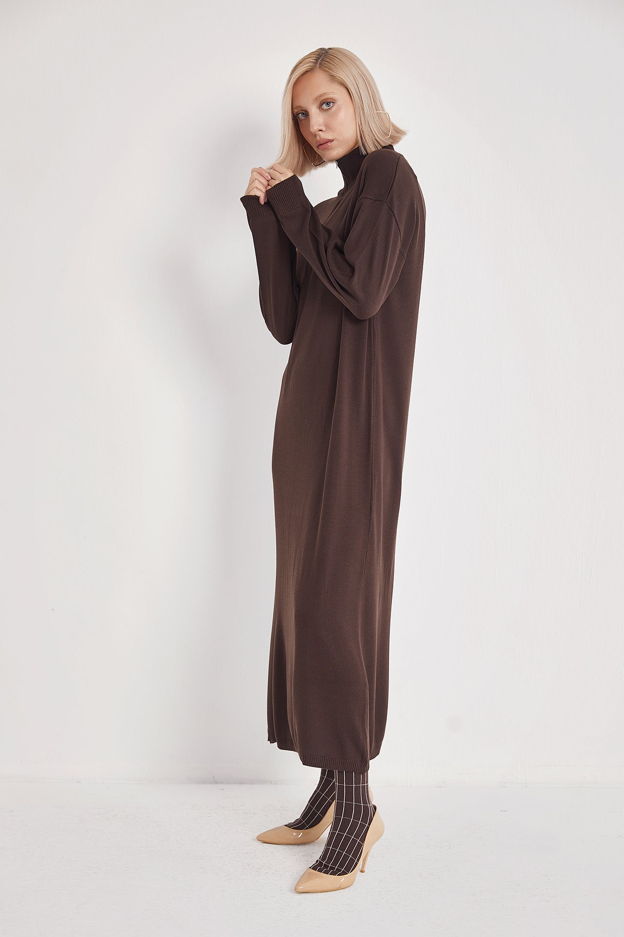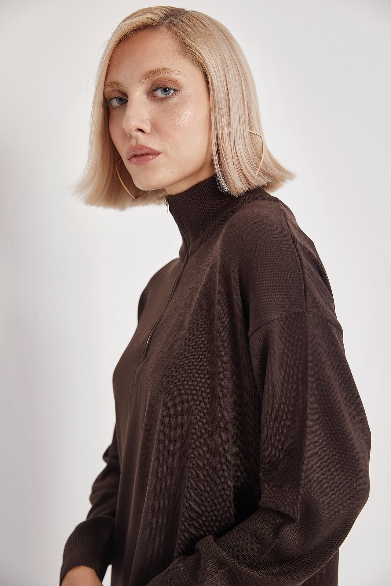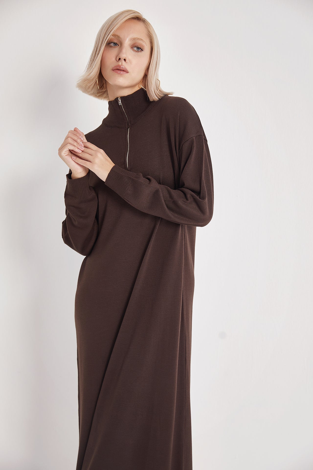 High-Neck Cotton Knit Dress with Zipper - Brown