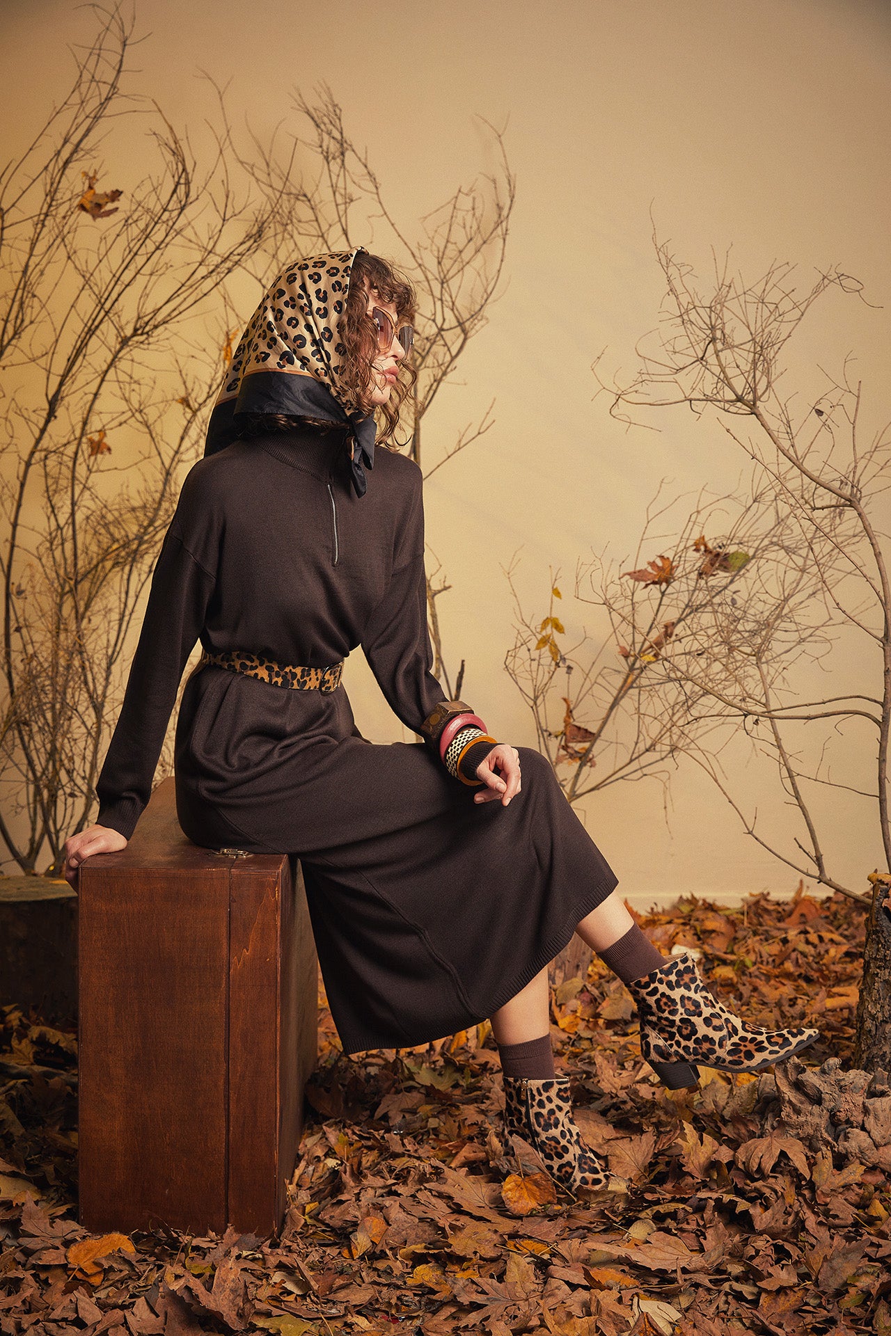 High-Neck Cotton Knit Dress with Zipper - Brown - Sage Collection